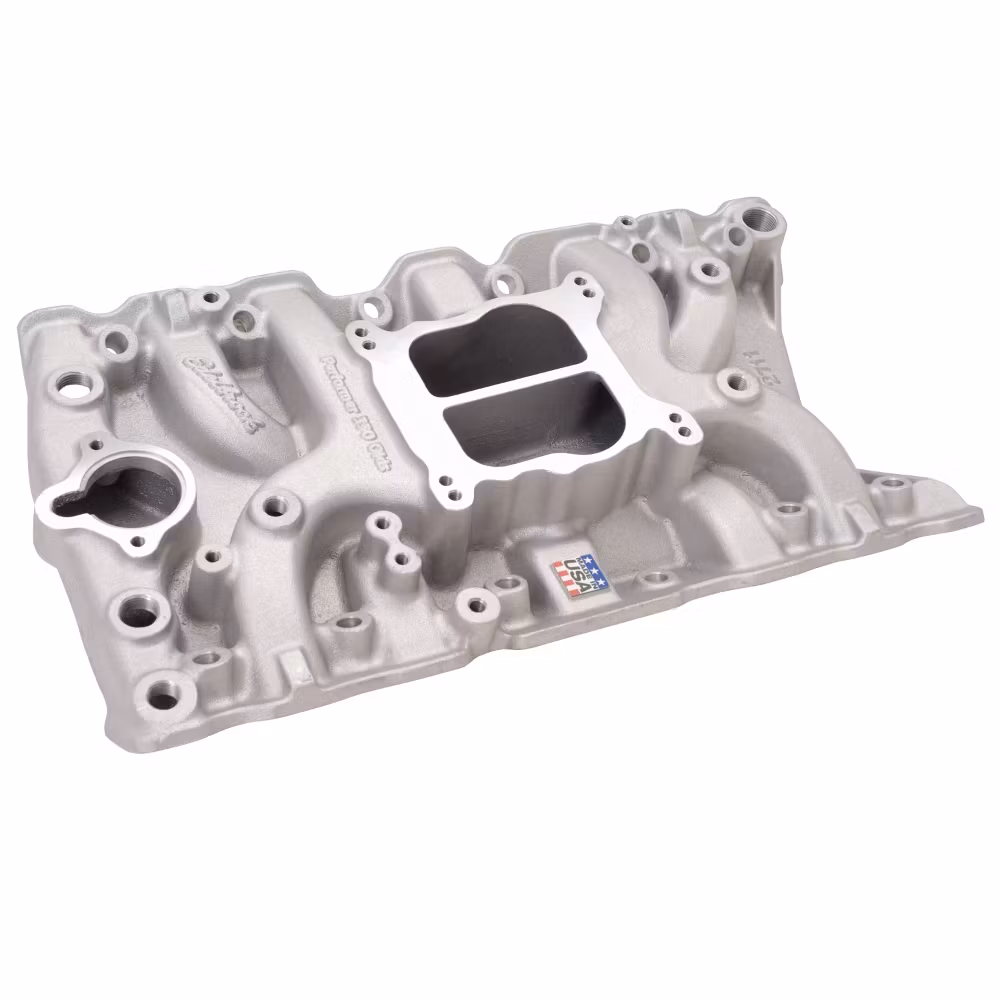 Edelbrock artikelnummer 2711 Performer Oldsmobile 350 insugningsmanifold är designad för Oldsmobile V8 307–330–350–403 kubiktum (1964–1985).